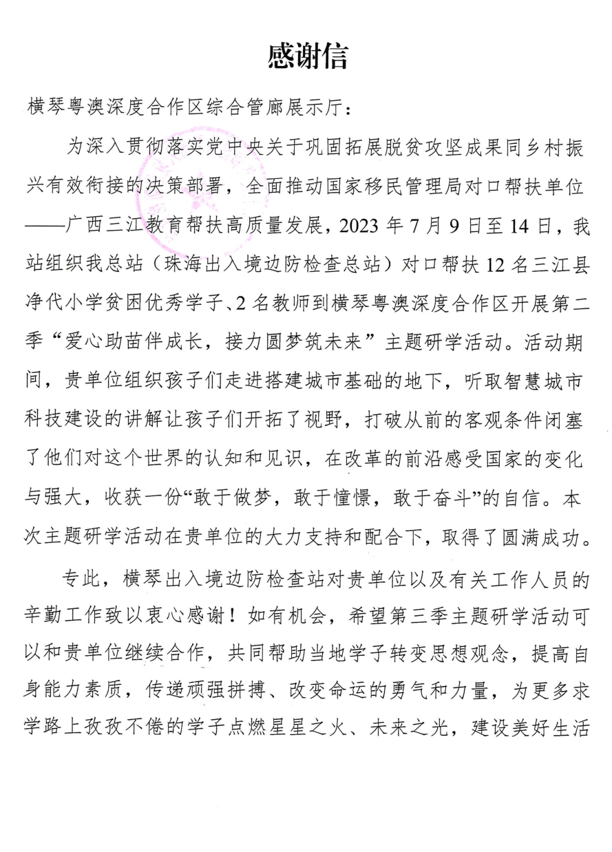 積極協(xié)助橫琴出入境邊防檢查站的“愛心助苗伴成長,接力圓夢筑未來”活動(dòng),從云端到地下娓娓介紹,幫助優(yōu)秀三江學(xué)子感知國際化都市的發(fā)展脈搏,了解智慧城市的科技建設(shè),得到橫琴出入境邊防檢查站和參觀學(xué)子的肯定和感謝。