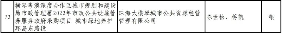 喜訊,2023年度,廣東省風景園林與生態(tài)景觀協(xié)會科學技術獎(園林工程獎)評選日前落幕,珠海大橫琴城市公共資源經(jīng)營管理有限公司(以下簡稱大橫琴城資)管養(yǎng)的橫琴粵澳深度合作區(qū)城市規(guī)劃和建設局市政管理署2022年市政公共設施管養(yǎng)服務政府采購項目——城市綠地養(yǎng)護環(huán)島東路段榮獲養(yǎng)護類銀獎。