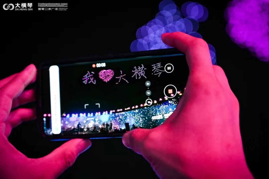 當晚,橫琴口岸正上空,還演繹了一場點亮夜空、打破傳統(tǒng)的星空大秀。一架架無人機排著整齊的隊列,在夏日的夜空里亮起了點點星光。機群盤旋上升匯聚,在空中先后編織出“我愛橫琴”、“25”、“金蓮花”等一個個絢麗的方陣,在夜空中留下了一個個美好的祝福,而在場的觀眾也隨著無人機方陣的變化,許下對琴澳協(xié)同發(fā)展的美好期許。